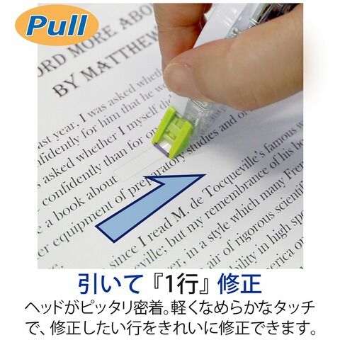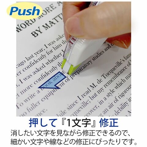 ◆2WAY機能で『引いて』1行、『押して』1文字の修正ができる。一般的な引いて1行の修正に加え、本体を反転すると「文字を見ながら押して1文字」の修正が可能です。利き手を問わない、ユニバーサル仕様です。