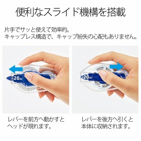 ◆たっぷり20m使える長尺タイプの修正テープ。20m分のテープを搭載した最強コスパのスライド式修正テープ。全体的に角を落とした丸みのあるデザインで、超大容量でも手になじむ。