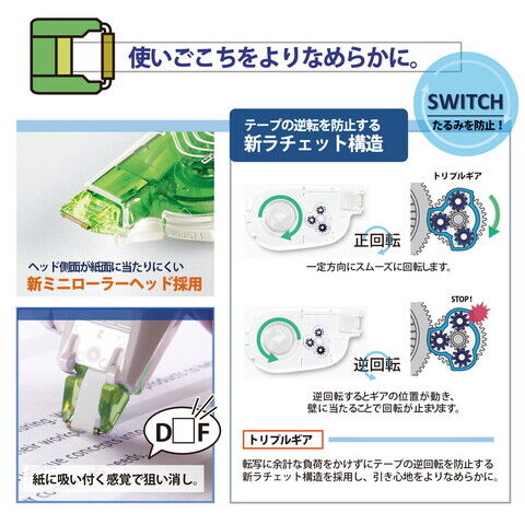 ◆修正テープユーザーの不満点を改善し、使い勝手にこだわったヘビーユーザー向けの修正テープ、ホワイパースイッチ。