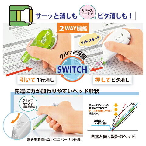 ◆直線で引いて消すだけでなく、本体を反転させると「リバースモード」に。修正箇所を確認しながら狙った文字だけを細かくキレイに修正できます。※利き手を問わない、ユニバーサル仕様。