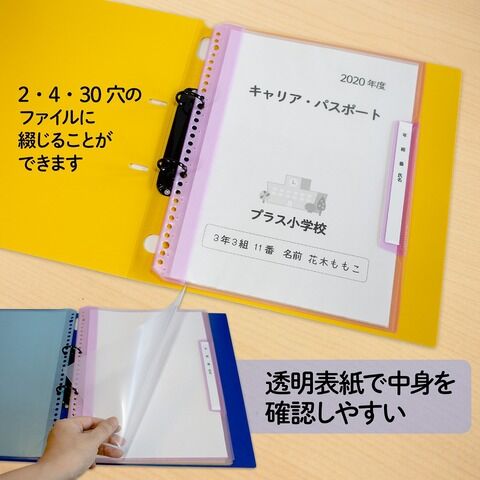 ◆ファイルに綴じられるクリアーファイル。透明表紙で中身を確認しやすく、2・4・30穴のファイルに綴じて管理することができます