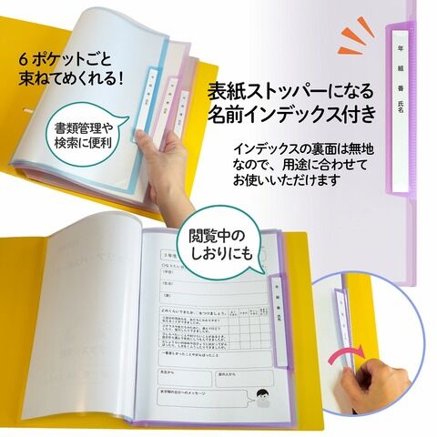 ◆表紙ストッパー付きでストッパー部分には名前インデックスが付いており、生徒毎の書類管理や検索に便利。インデックスの裏側は無地のため、オフィスや個人でもお使い頂けます