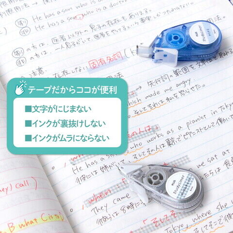 ◆テープ幅6mmタイプ。(上下余白あり。印刷幅は4.8mm)ノートや教材の気になる文字の上に引いて識別できる。