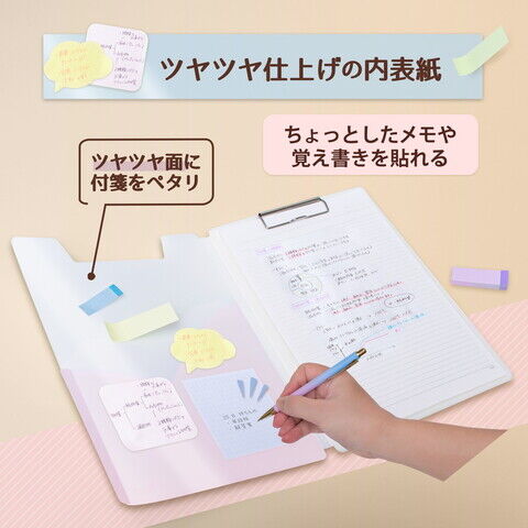 ◆表紙内側はツルツルとした鏡面仕上げで授業メモなどの付箋を貼り付けることができます。