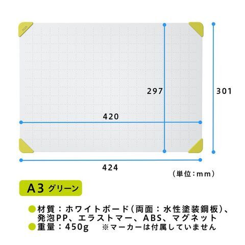 - 材質:ホワイトボード(水性塗装鋼板)、発泡PP、エラストマー、ABS、マグネット