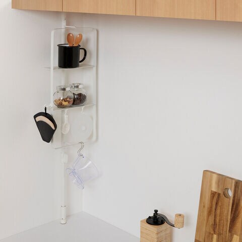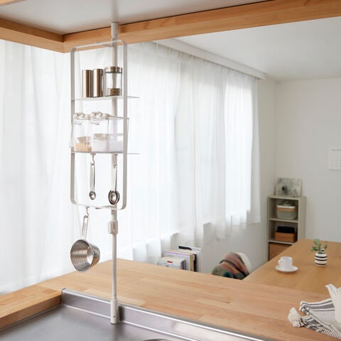 ◆こちらは、置く・掛けるの収納が可能な1本脚のキッチン突っ張りスチールラックです。