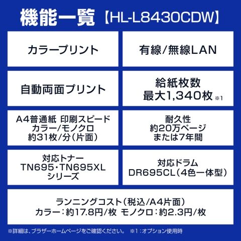 ※パソコンとの接続ケーブル(USB/LANケーブルなど)は同梱されておりません。また、操作などに関する詳しい説明書は同梱しておりません。詳細は【brotherサポートページ】をご確認ください。