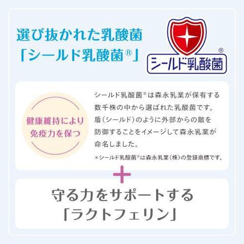 ◆盾(シールド)のように外部からの敵を防御することをイメージして森永乳業が命名しました。※シールド乳酸菌(R)は森永乳業(株)の登録商標です。