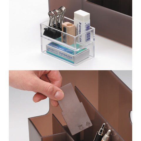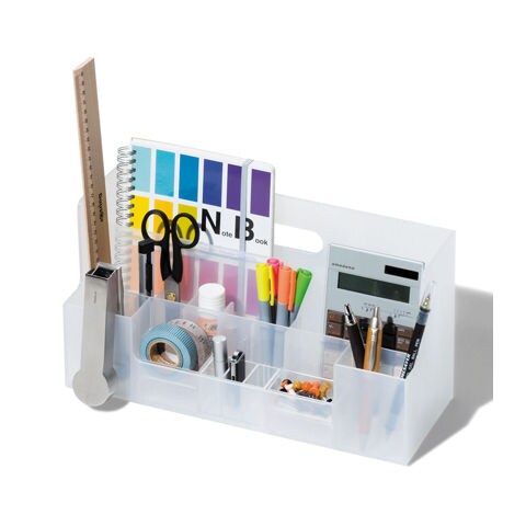 ◆後列にはファイルや書類、雑誌など背の高いもの中列はハサミやものさし、メガネなど前列にはハンコやクリップ、付箋など収納物を高さごとに分けることで見つけやすくなり、探し物の時間を減らせる
