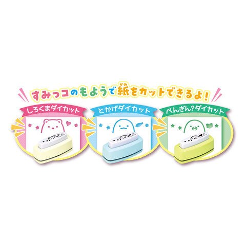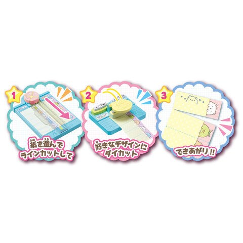 ラインカット台×1台 ダイカット台×1台 カッターマットスペア×2本 ダイカットデザイン×3種 キャラクタースタンド×5種 デコシール×1枚 デザイン紙×18枚 練習用デザイン紙×2枚 すみっコファイル×1部 取扱説明書×1部