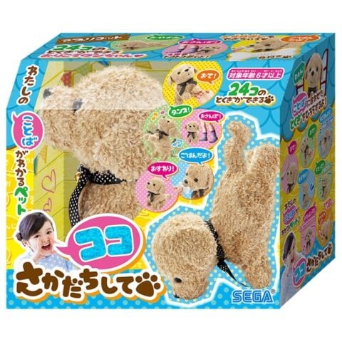名前をよぶ : お名前「ココ」をよぶと、「ワンワン」とお返事するよ おすわり : 「ワンワン」とないて、おすわりするよ ふせ : 「ワンワン」とないて、腹ばいになるよ おて : 「ワンワン」とないて、立ちあがり、前足を上下するよ さかだちして : 「わお~ん」とないて、さかだちするよ あそぼ : 「ふがふが」とないて、頭を下げて歩くよ うたって : おすわりして、「アルプス一万尺」(犬語)をうたうよ だっこ : 「ワンワン」とないて、立ち上がって歩くよ おやすみ : いびきをかいて、腹ばいになって寝るよ いいこいいこ : よろこんで「ワンワン」となきながら、座ったまま歩くよ ダメダメ : 「く~ん」と悲しんで、頭を下げて歩くよ ごはんだよ : 骨を口に近づけると「がぶがぶ」と食べる音を立てるよ おいで : 「ワンワン」となきながら、前に歩くよ うでたて : 「1212」(犬語)となきながら、うでたてふせをするよ Hello : おすわりをして、「ハロー」(犬語)となくよ はくしょん : 座りながら歩いて、「はくしょん」(犬語)となくよ じたばた : 腹ばいになって、足をバタバタ動かしながら、「フガフガ」となくよ おたんじょうび : おすわりして、「Happy birthday to you」(犬語)をうたって、さかだちするよ ダンスしよう : 「BABY SHARK」か「ココダンス」のどちらかをダンスするよ ヨガのポーズ : 腹ばいのポーズでのびをしながら、「ポーズ」(犬語)となくよ おさんぽ : 「ワンワン」となきながら、約30秒程度前に歩くよ おしゃべりしよ : しゃべりかけると「ふ~ん」(犬語)「うんうん」(犬語)のどちらかのお返事をするよ まて/よし : 次の命令「よし」を認識するまで、じっと待つよ おなら : 「ぷっ」とおならの音がするよ