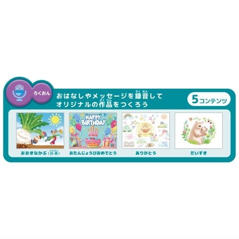 おはなし:さんびきのくま、ブレーメンのおんがくたい、うさぎとかめ、ながぐつをはいたねこ、さんびきのこぶた、おおきなかぶ ろくおん:おおきなかぶ、おたんじょうびおめでとう等 まなび:あいうえおパレード、ABCパレード、どうぶつのなまえ、てあそびうた等 リラックス:おやすみストレッチ、ヒーリング(音楽)等