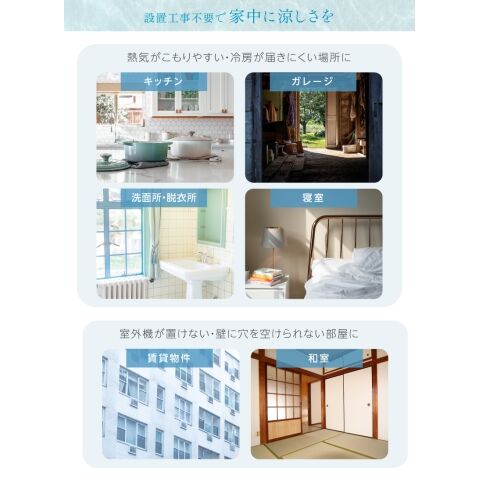 - 付属品:排熱ダクト(約40~120cm)伸縮式、ダクトエンドA・B×各1、窓パネルA・B×各1、レール用アタッチメント×2、ネジ×4、四角ボルト×1、蝶ナット×1、ドレンホース×1、 リモコン
