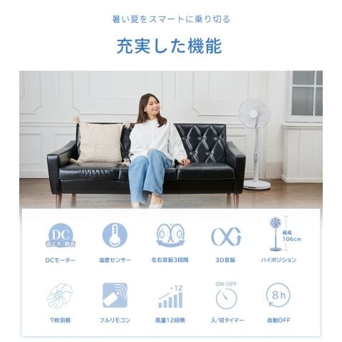 一般的なリビング扇より高く伸ばせるので、ソファなどの家具に風を遮られません。