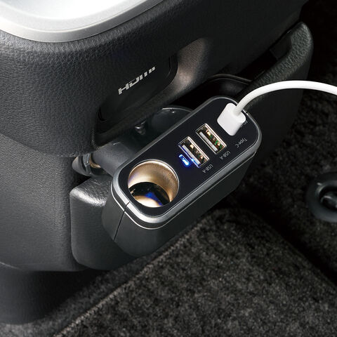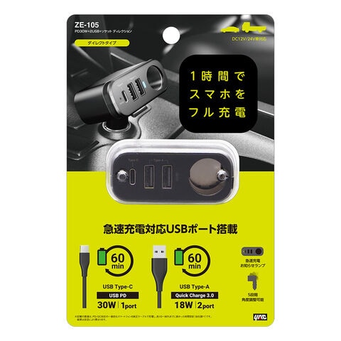 - 仕様:DC12V/24V共用、ソケット最大許容出力電流5A、[USB Type-Cポート]PD30W[USB Type-Aポート]QC3.0 18W