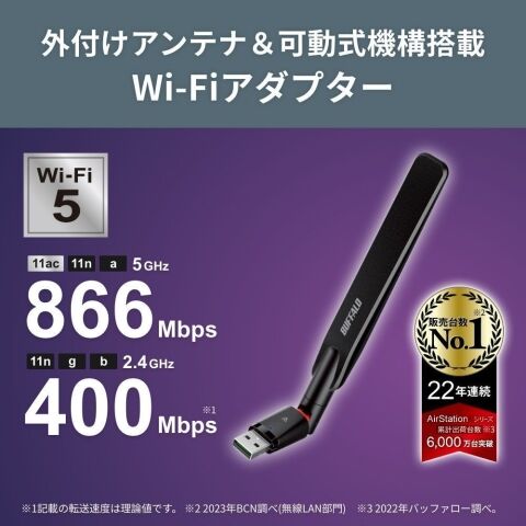本商品はパソコンのUSB端子に装着することで、お手軽にWi-Fi 5(11ac)に対応したWi-Fi機能を追加することができます。USB3.2(Gen 1)に対応しているので、Wi-Fi 5の速度を余すことなく活かすことができます。
