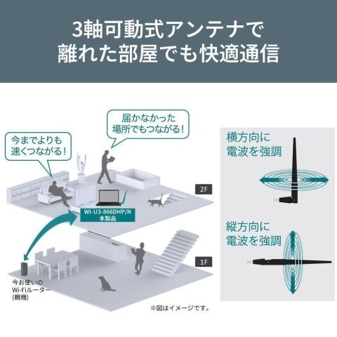 本商品は、親機が子機の位置や距離を判別して、複数のアンテナの電波を同時に届かせ高いスループットを実現する「ビームフォーミング」に対応しています。遠距離でも電波感度、通信速度を維持することができ、障害物が多い環境においても、安定したWi-Fi通信ができます。