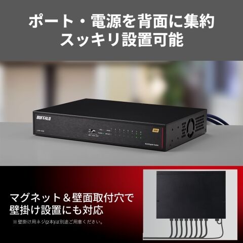 本商品は、壁面設置用ネジ穴付きスイッチングハブです。 機器用の収納ボックスへ固定設置ができ、ルーターや電源タップとまとめてスッキリ収納できます。配線が複雑になりがちな収納ボックス内への設置が可能です。また、標準添付のマグネットで金属壁面への取り付けが簡単に行え、スチールのデスクやラックへの取り付けも可能です。※壁掛け用ネジ(2本)は別途ご購入ください。※本商品周辺温度が製品仕様温度内で収まる様に設置をしてください。