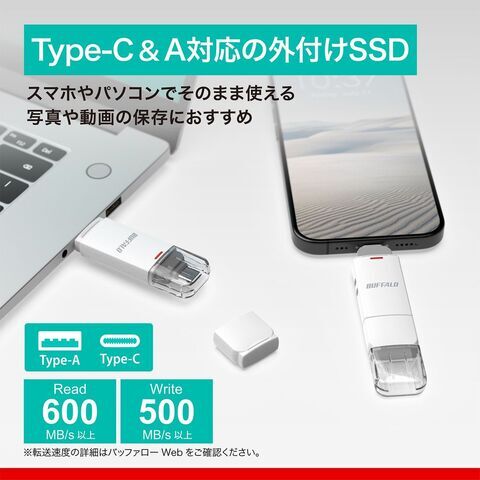 バッファロー|BUFFALO USB 3.2(Gen2) Type-C/Type-A両対応 スティック型SSD 500GB(ホワイト) SSD-SDU3シリーズ SSD-SD500U3-WA 【返品種別B】