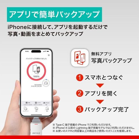 本商品は、バッファローアプリ「写真バックアップ」(無料)に対応。大切な思い出をもっと簡単に保存できます。