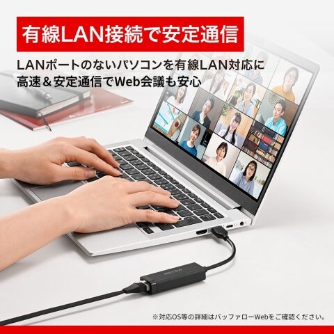 本商品をUSB Type-A端子に接続することで、LANポートのない機器で有線LANを使用することができます。Wi-Fiが不安定な場所で有線LANを使用したいときや、有線LAN環境しかないホテルや宿泊先などでインターネットを利用したいときに、便利にお使いいただけます。