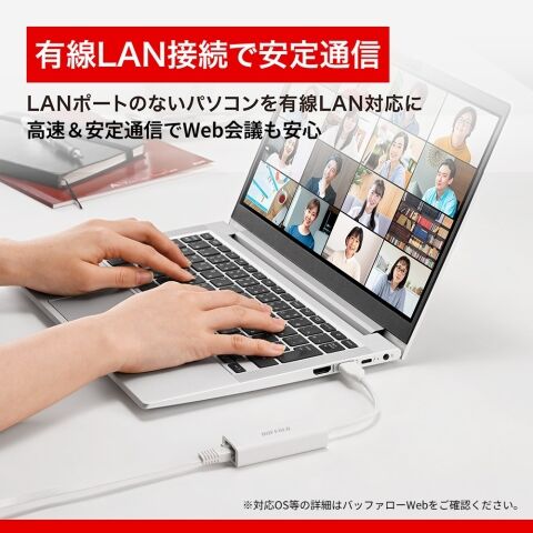 本商品をUSB Type-A端子に接続することで、LANポートのない機器で有線LANを使用することができます。Wi-Fiが不安定な場所で有線LANを使用したいときや、有線LAN環境しかないホテルや宿泊先などでインターネットを利用したいときに、便利にお使いいただけます。