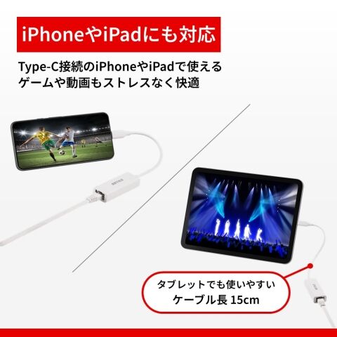 本商品をUSB Type-C端子に接続することで、LANポートのない機器で有線LANを使用することができます。Wi-Fiが不安定な場所で有線LANを使用したいときや、有線LAN環境しかないホテルや宿泊先などでインターネットを利用したいときに、便利にお使いいただけます。