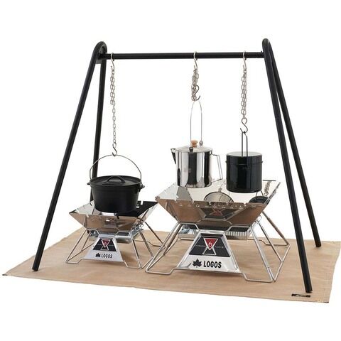 - 仕様:たき火台にセットすれば、吊り調理が同時に3カ所で実施できます。長めのチェーンなので、様々なサイズの鍋やたき火台に対応します。簡単組み立て構造、しかも収納サイズはコンパクト。ハンガーラックとしても利用できます。