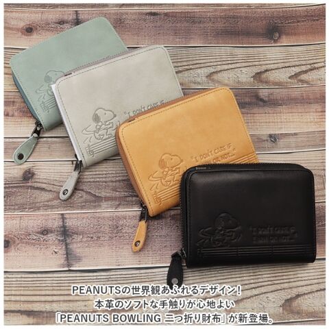 ◆ヴィンテージ感あふれるSNOOPYの型押しデザイン! 本革のソフトな手触りが心地よい「PEANUTS BOWLING 二つ折り財布」が新登場。