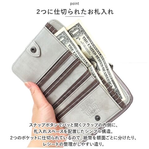 スナップボタンでパッと開くフラップの内側に、札入れスペースを配置したシンプル構造。2つのポケットに仕切られているので、紙幣を額面ごとに分けたり、レシートの整理がしやすい造り。