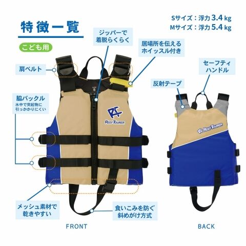 - サイズ:S 身長 95~135cm/胸囲 49~67cm 浮力3.4kg、M 身長 125~165cm/胸囲 61~84cm 浮力5.4kg