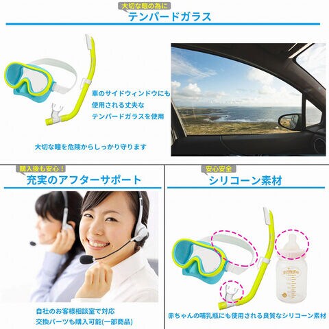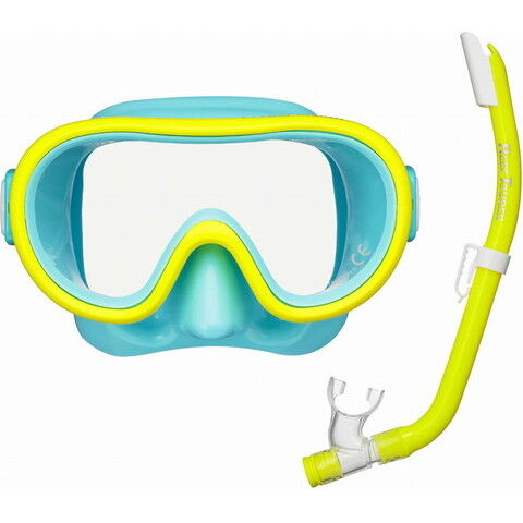 ◆カラフルな子ども用1眼マスクとWガード&排水弁付きスノーケルのセット。