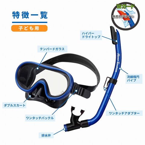 ◆カラフルな子ども用1眼マスクとWガード&排水弁付きスノーケルのセット。