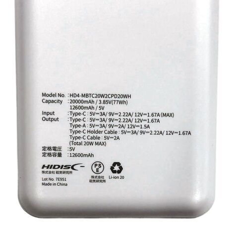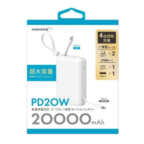 HIDISC PD20W急速充電対応 ケーブル一体型モバイルバッテリー 20000mAh(ホワイト) HD4-MBTC20W2CPD20WH 【返品種別A】