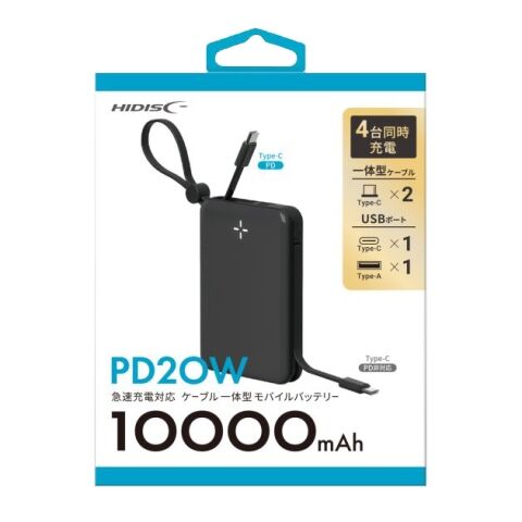 HIDISC PD20W急速充電対応 ケーブル一体型モバイルバッテリー 10000mAh(ブラック) HD4-MBTC10W2CPD20BK 【返品種別A】