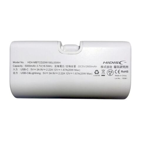 HIDISC 180°回転コネクター直挿し Lightning モバイルバッテリー 5000mAh PD20W対応(ホワイト) HD4-MBTCD20W180L05WH 【返品種別A】