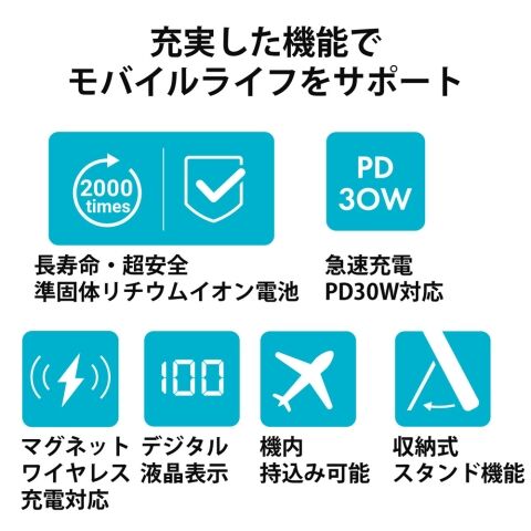 (Type-C+ワイヤレス:20W Max) - 蓄電時間:約1時間40分(PD30W充電時)