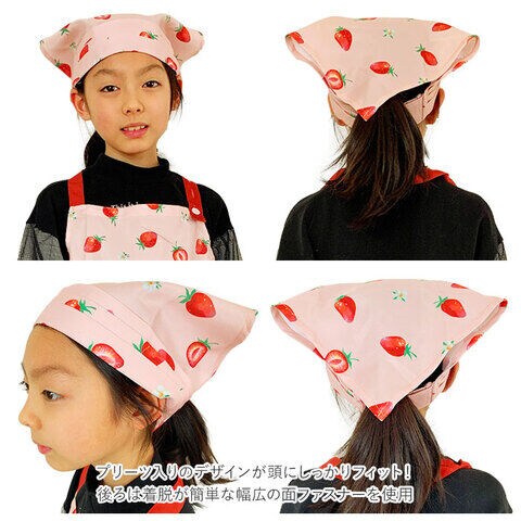 ◆三角巾はプリーツ入りのデザインが頭にしっかりフィット! 後ろは着脱が簡単な幅広の面ファスナーを使用。