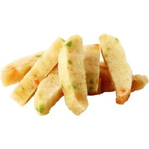 ■原材料:肉類(鶏ささみ、鶏肉)、小麦粉、糖類、じゃがいも、タピオカ加工でん粉、食塩、植物油脂、ほうれん草、にんじん、グリセリン、トレハロース、膨張剤、ソルビトール、ポリリン酸Na、保存料(ソルビン酸K、デヒドロ酢酸Na)、酸化防止剤(ビタミンE)、リン酸塩Na、着色料(黄4・5、青1、赤3)