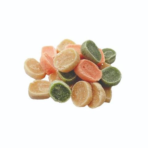 ■原材料:小麦粉、鶏肉(ささみ、胸肉)、でん粉類、砂糖、さつまいも、植物油脂、にんじん、ほうれん草、グリセリン、ソルビトール、食塩、ポリリン酸Na、香料、着色料(黄4、青1、赤106)