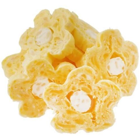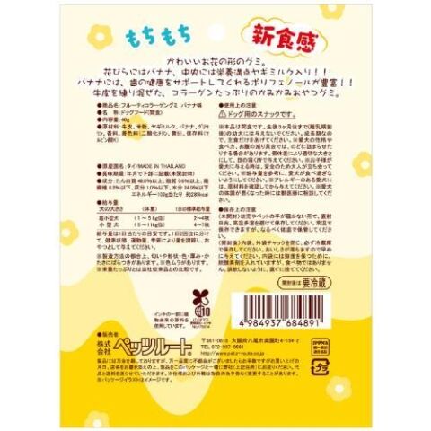 ■原材料:牛皮、米粉、ヤギミルク、バナナ、グリセリン、香料、着色料(二酸化チタン、黄5)、保存料(ソルビン酸K)