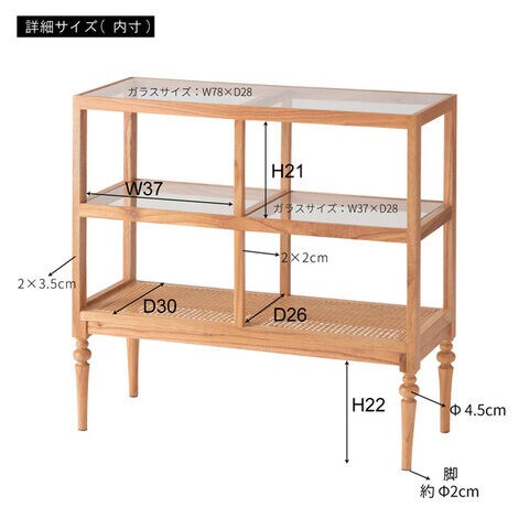 - 材質:天然木化粧繊維板(ミンディ)、天然木(ミンディ)、ラタン、ラッカー塗装、5mm強化ガラス