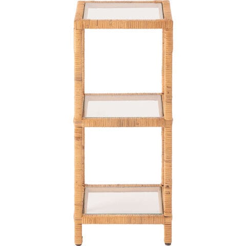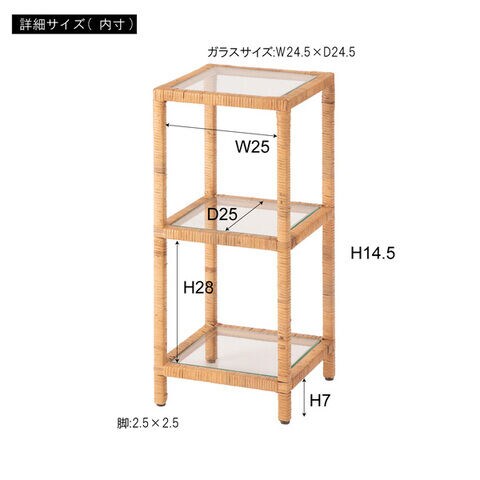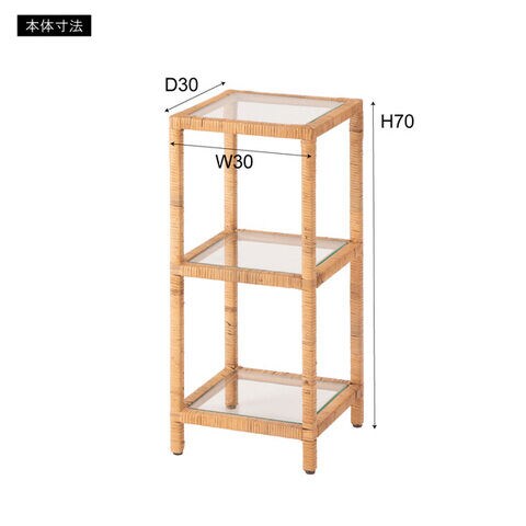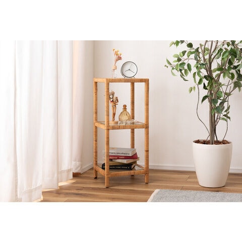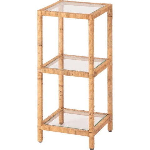 ◆透明感が美しい取り外し可能なガラスと、スチールフレームに巻いた天然ラタンの相性がぴったりなガラスシェルフ。