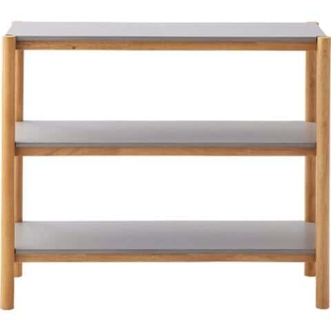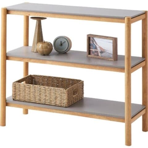 ◆木目を活かしたナチュラルなフレーム部分と、絶妙なくすみグレーの棚板のコントラストがやさしい印象を与えてくれるシェルフです。