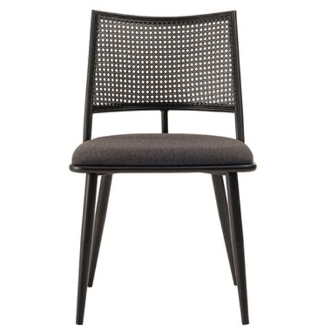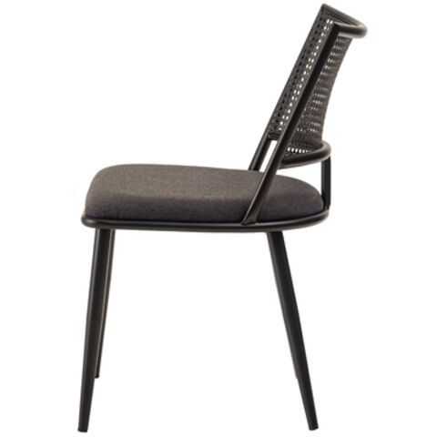 ◆シンプルながら目を引くかごめ編み調デザインを施した背面と、艶を抑えたブラックスチールの組み合わせがモダンなチェア。