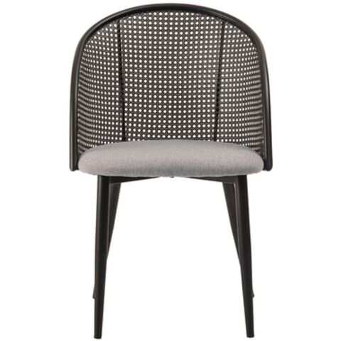 ◆シンプルながら目を引くかごめ編み調デザインを施した背面と、艶を抑えたブラックスチールの組み合わせがモダンなチェア。