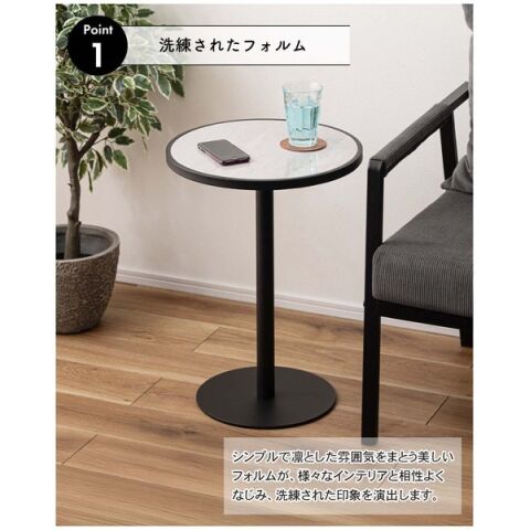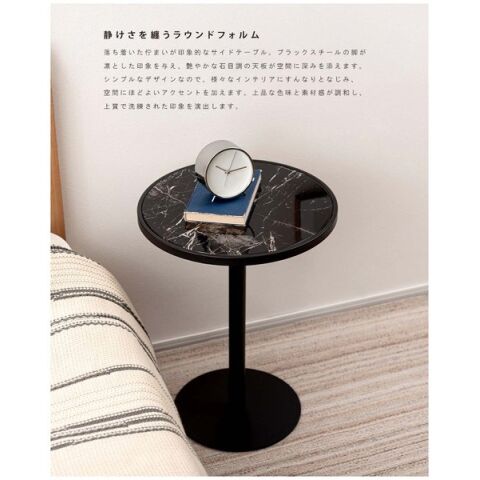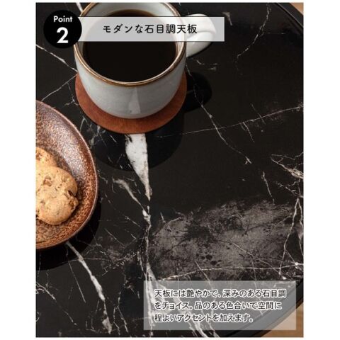 ◆ブラックスチールの脚が凛とした印象を与え、艶やかな石目調の天板が空間に深みを添えます。