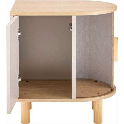 ◆スマートなプッシュオープン式扉と特徴的な曲面に沿ったスライド扉、それぞれ異なる収納スペースを設け小物や本をスマートに収め、用途に合わせた使い分けができます。
