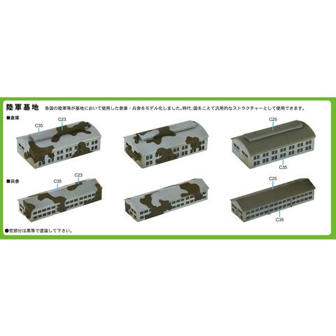 各国の軍隊等が基地において使用した倉庫・兵舎をモデル化。