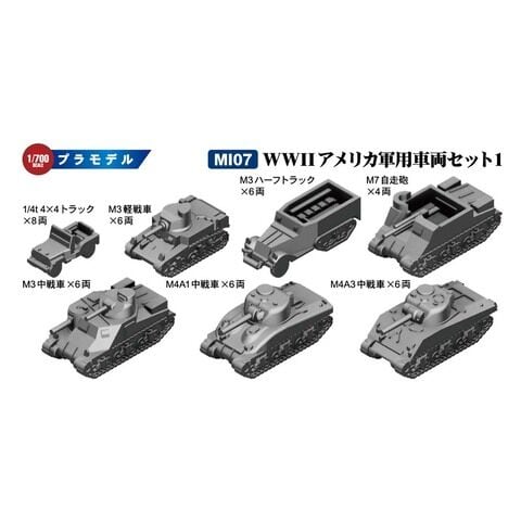 大戦中のアメリカ陸軍の代表的な戦車であるM4中戦車シリーズの他、M3中戦車、M7自走砲、トラック等の車両セットです。